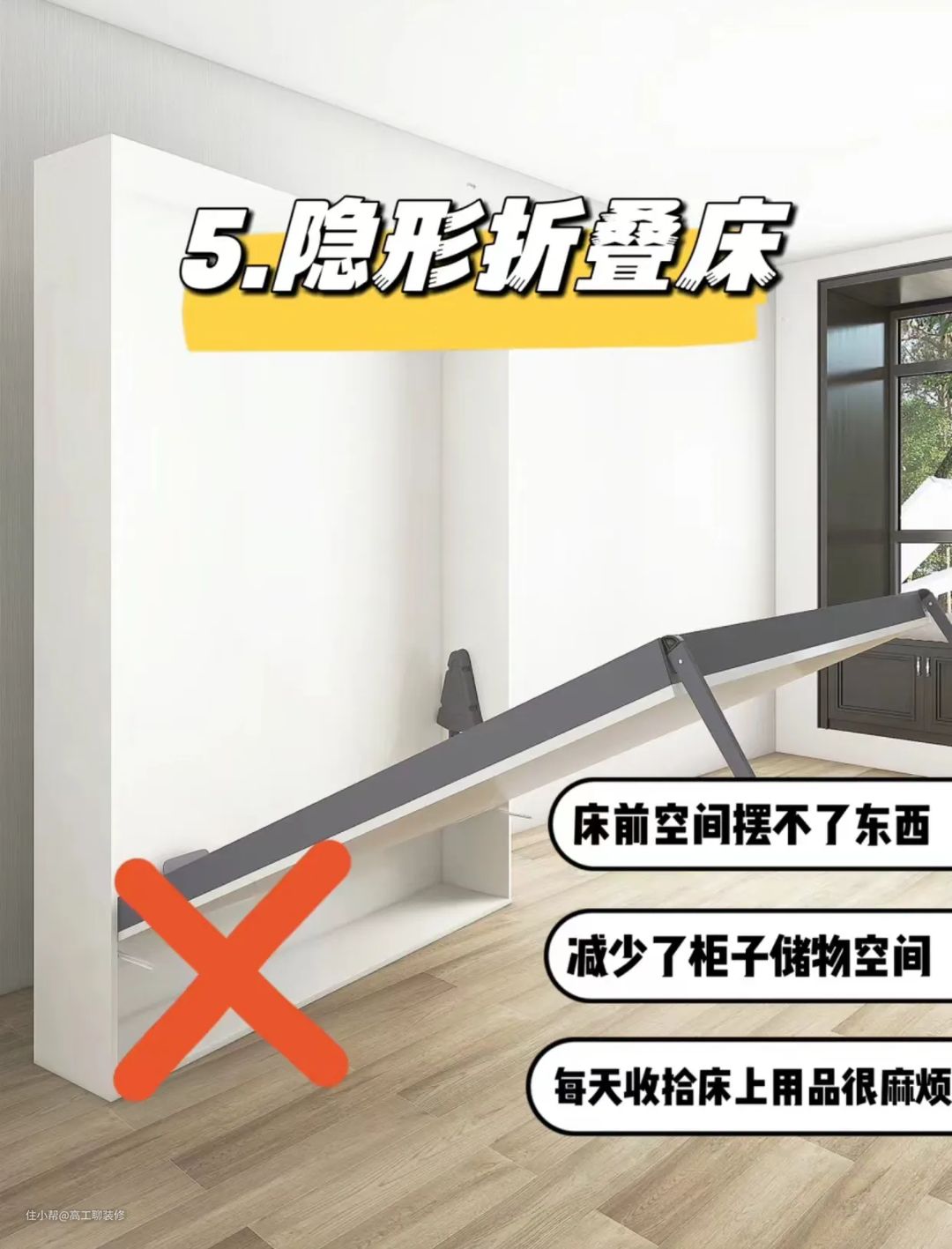 很多做定制出身的商家,为了吸引消费者的眼球,他们会把床做隐形折叠到柜子里面去,表面看上去比较节省空间,但实际仔细分析还真的不是那么回事。