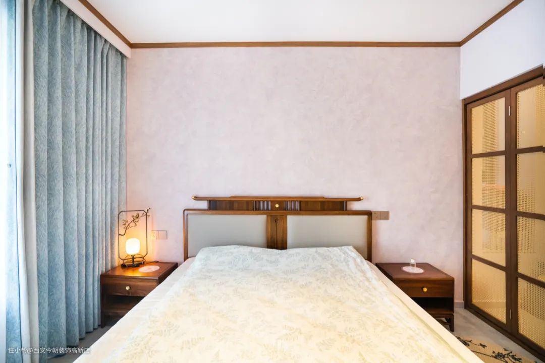 床头背景墙是我们选用艺术漆所打造出来的,整体透露出一种宋代美学的氛围感。