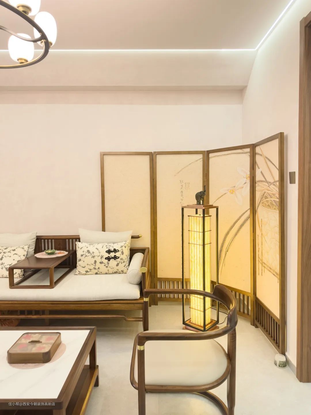 客厅的极简留白参考了徽宗笔下的瘦金体,塑造出去繁为简,大道至简的中式意境。