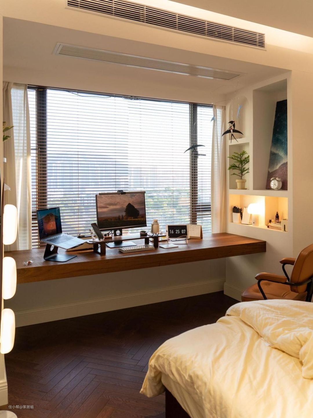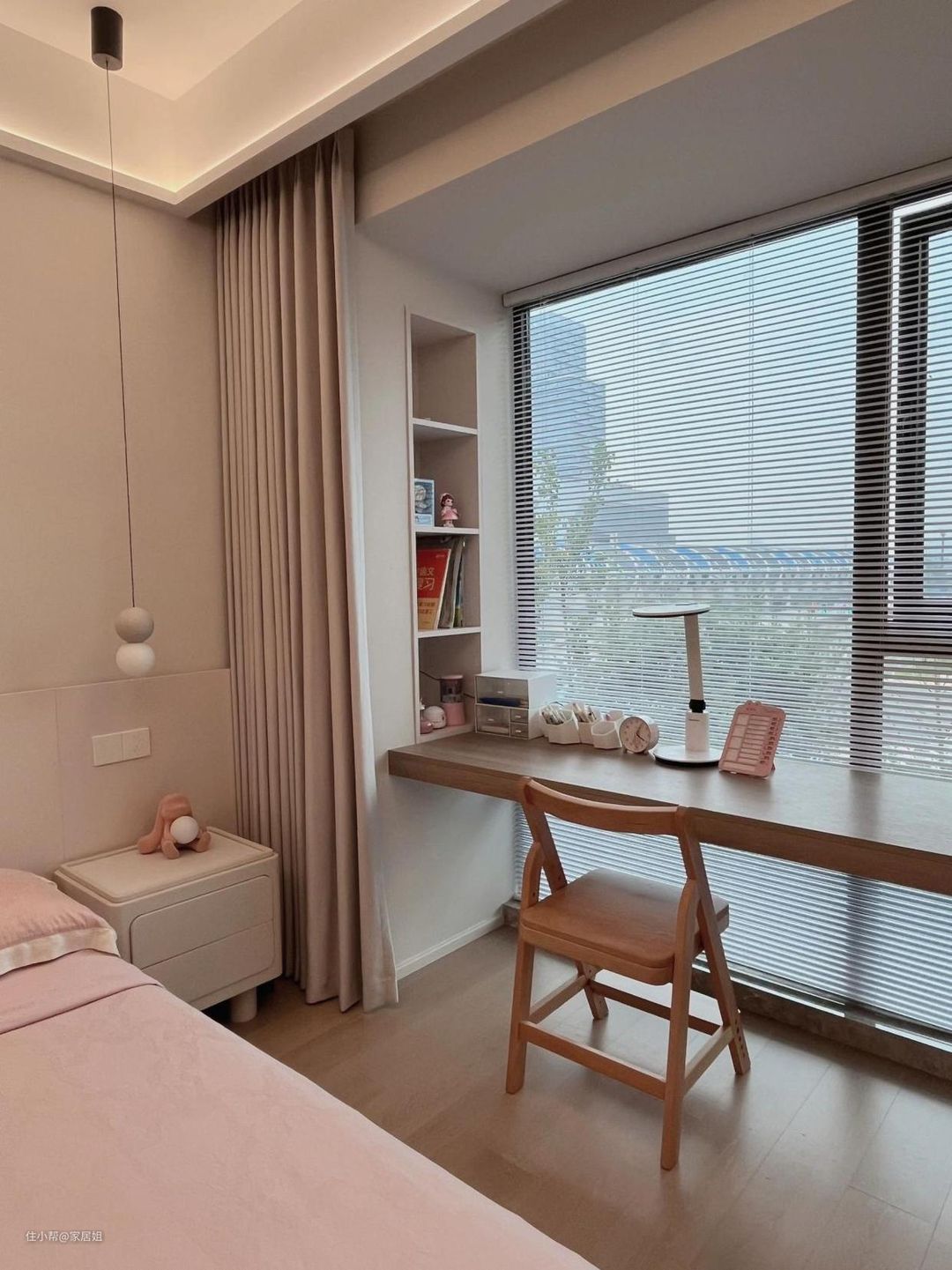 网友@大高小高的新家,打掉飘窗后,做了一个3米长的悬浮书桌,窗户两边做了异形壁龛洞,很有设计感,她说每天只要待在这个卧室,总会感到有无尽的惬意与温柔。