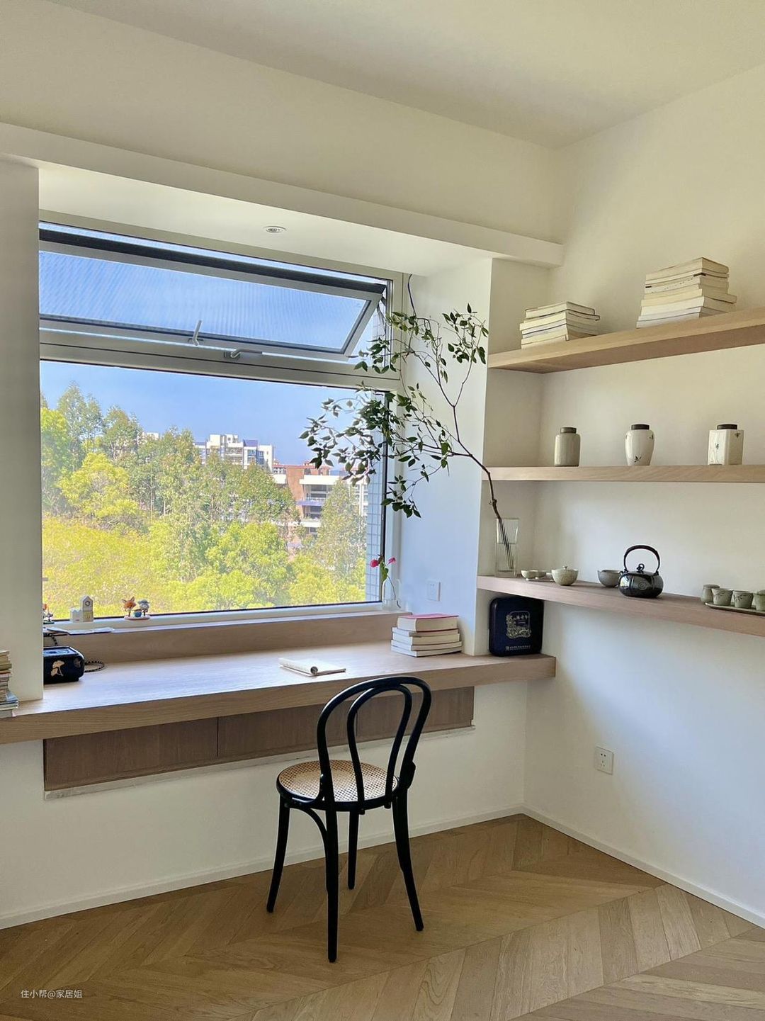 改造成木饰面包裹的茶书桌,闲时能坐在这里喝喝茶,一整面的大玻璃可以眺望窗外风景,桌上放置的绿植和窗外景色遥相呼应,呆上一整天都不会腻。