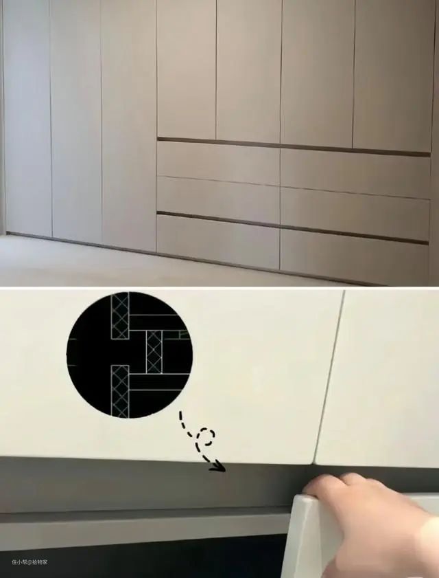 嵌入安装在柜门一侧的金属免拉手设计,打扫卫生的时候,柜门弄到腰,直接一个大伤口。小拾建议,家里的金属拉手,一定要逐个检查,并用砂纸打磨边角。