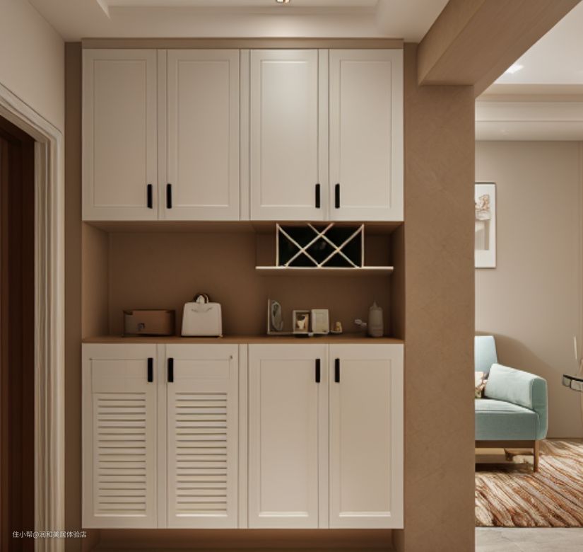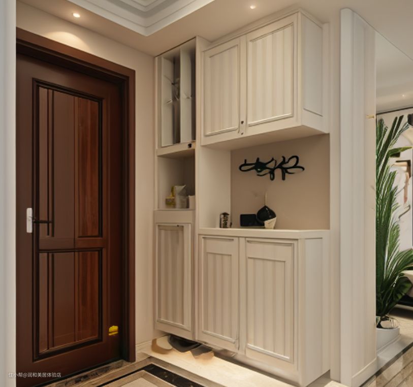 鞋柜宜有门,这样可以避免鞋子乱七八糟地堆放而无遮掩,也会更加美观。