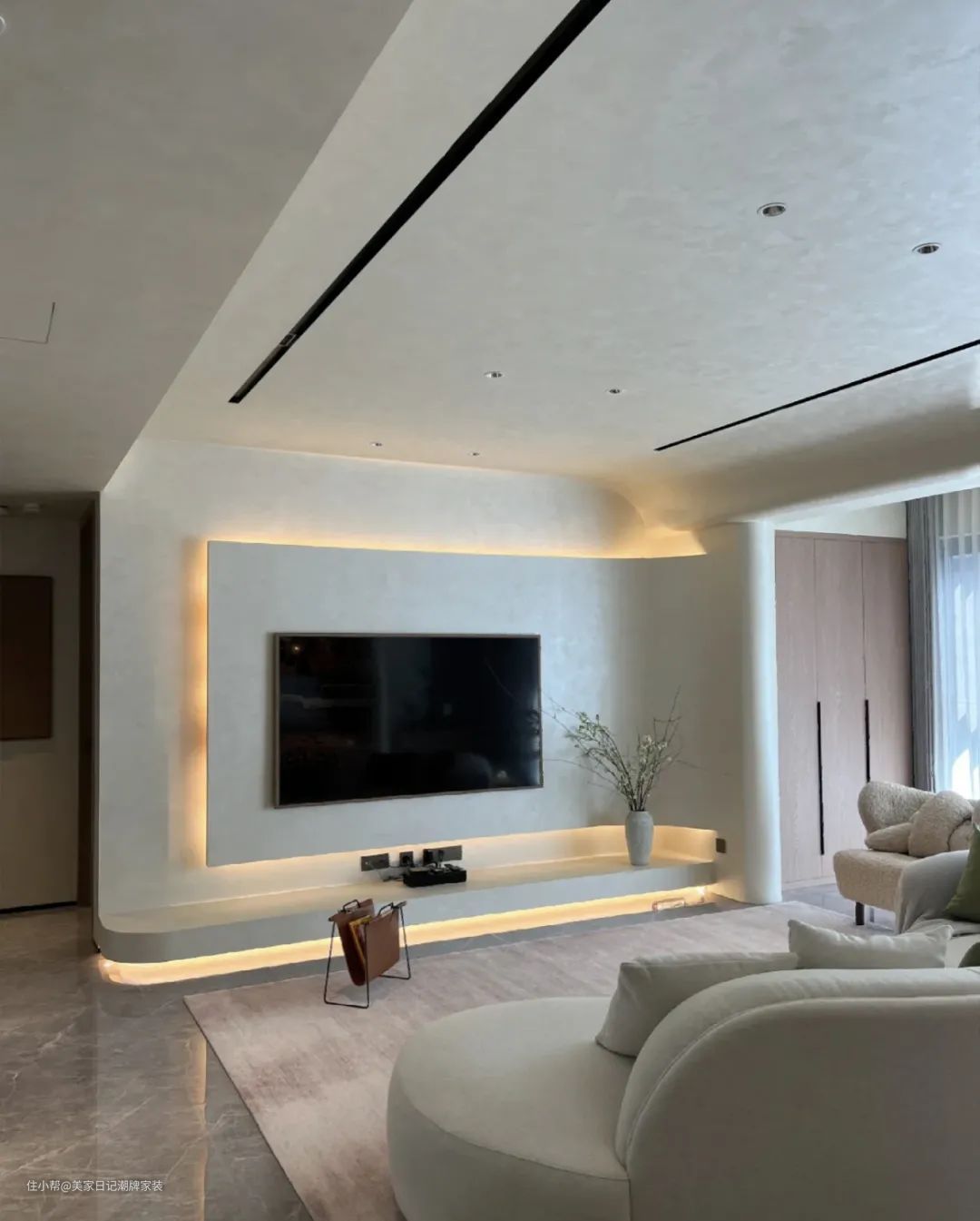 天鹅绒+现代轻奢。天鹅绒柔和的光泽和丝滑的质感,搭配曲面的电视背景墙,如同绸缎铺开一般,尽显现代轻奢。