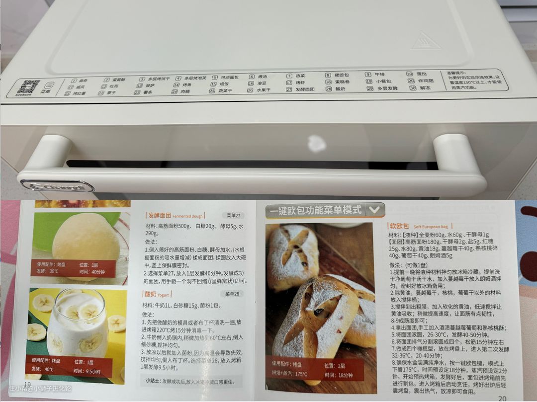 它还有一键蒸汽功能,不管是热菜还是烤硬欧包,都不在话下。烤硬欧包的时候,先蒸后烤,上色均匀,外脆内软,超级好吃。一键欧包功能,做出来是软欧包,做出来的欧包松软有弹力。