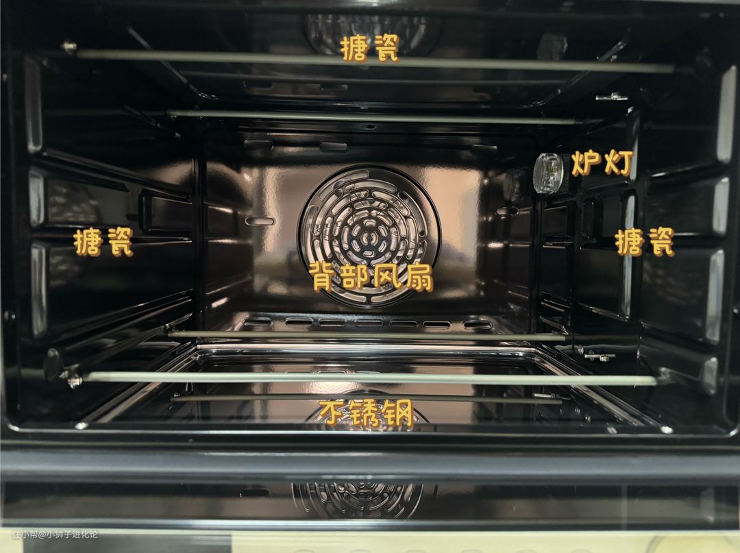 四面陶瓷釉内胆;只有3根不锈钢发热管,上下是1根M型发热管,背部有1根环形碳素加热管,可以三层同烤。