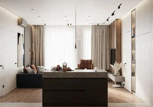 客厅、餐厅、厨房,三个区域,都是开放式的,没有什么隔断。只有岛台,既是厨房的一部分,又是餐厅的一部分,让厨房和餐厅相互连通,又有了一点点分界。