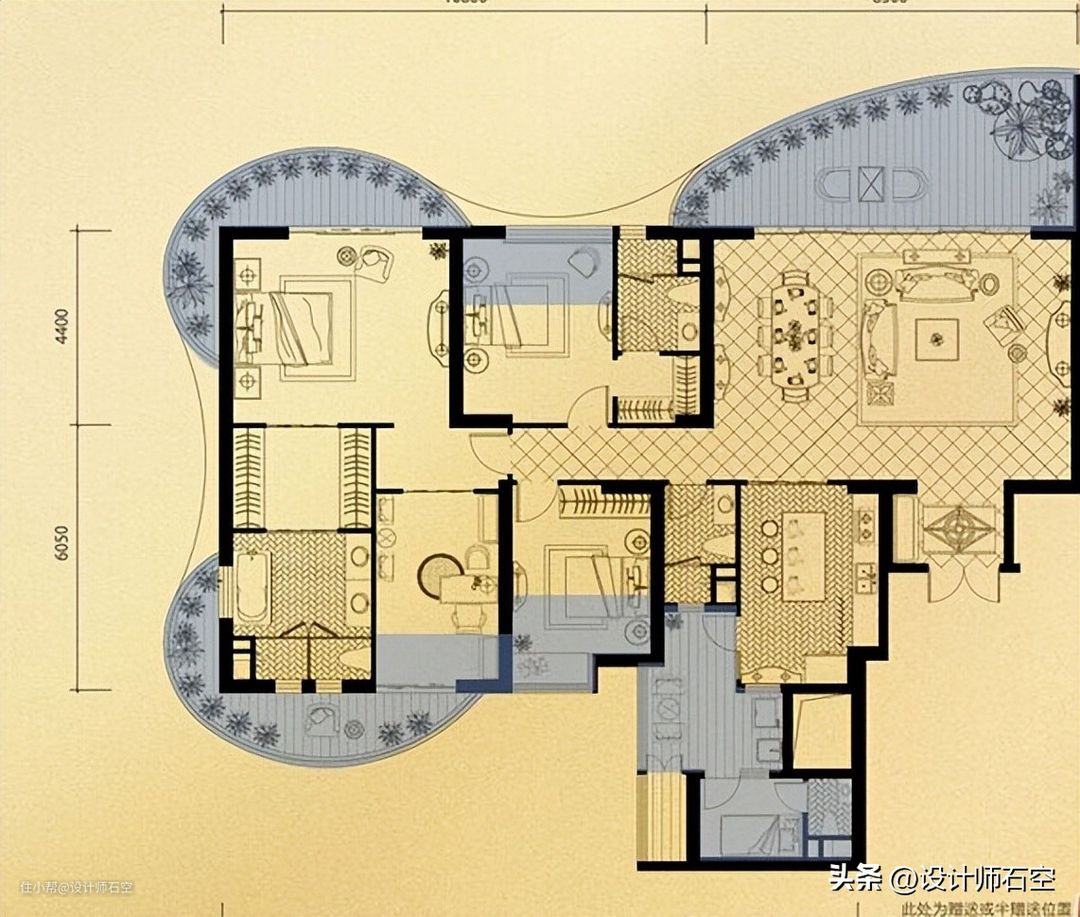 实际上这几个户型存在的问题是,层高不够,阳台太大到是室内空间光线较弱,承重结构较多导致室内空间可塑造性差。这几个问题到是室内外空间很大,但是利用率相对减弱了。但是得益于它的大面积,你依然可以实现大书房、大花园、健身、弹琴、游戏、音影、独立套间、保姆间、独立洗衣房、独立中西厨、独立四分离卫生间等等。