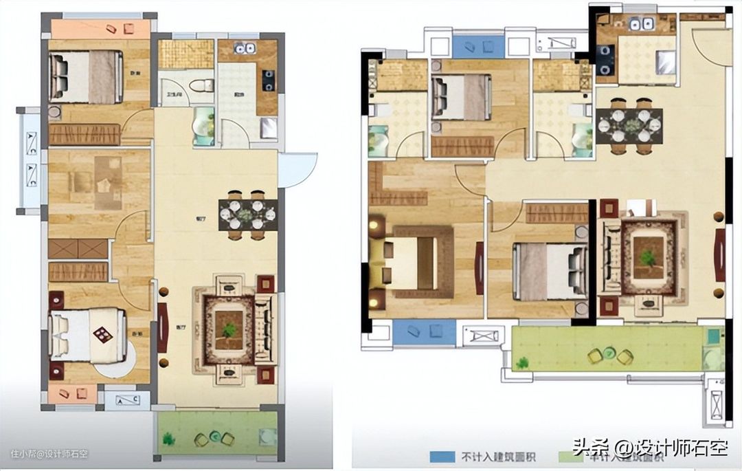 右边的户型进深相对小一些,但是是双卫,客餐厅小一点,但是整个户型的空间利用率更高一些。