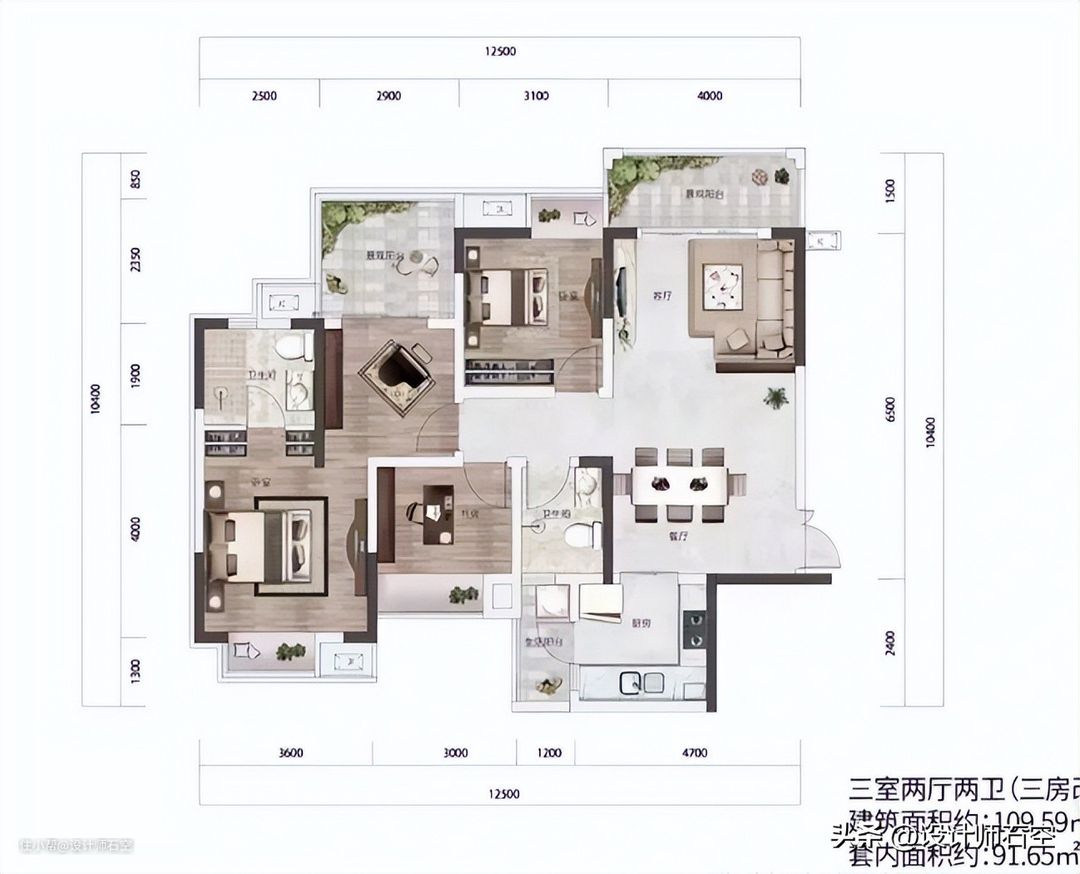 比如下面这个户型图,套内90,还是3室2厅2卫,看图是不是觉得还挺宽敞的?其实它是把家具尺寸的比例缩小了。