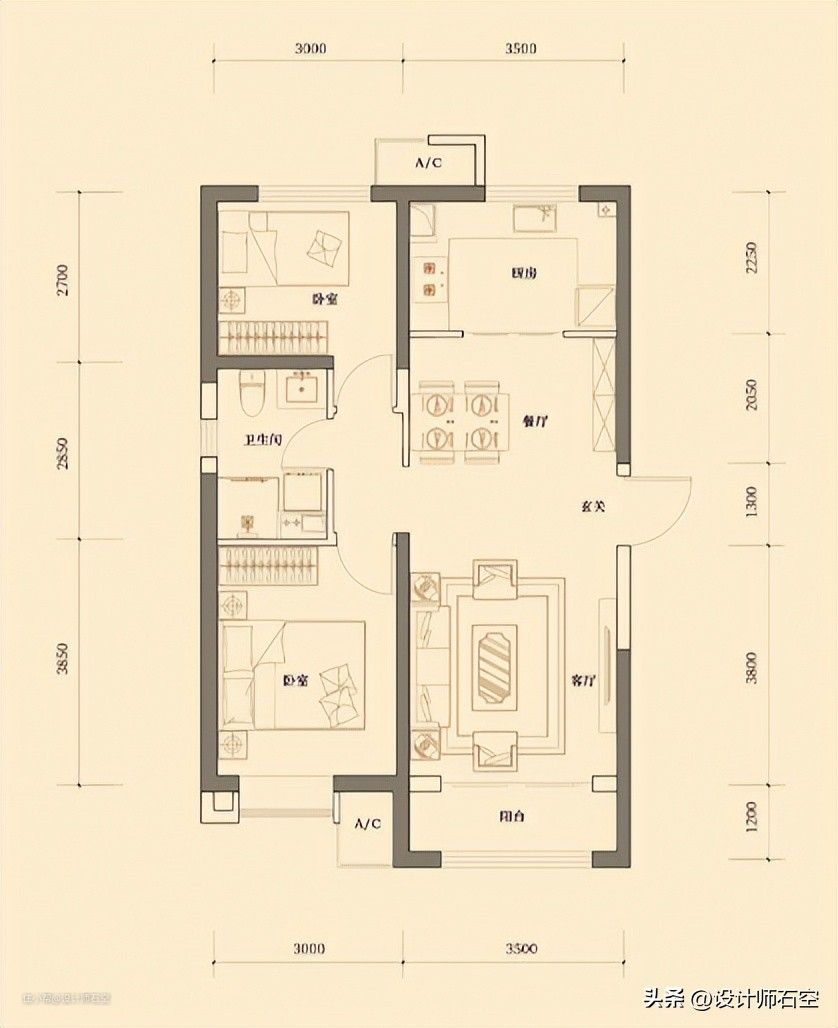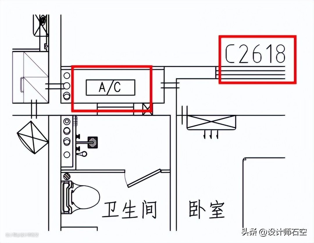 空调外机:大部分户型图会用矩形中间一个AC字母来表示,也有的会用矩形中间一个X,常见位置是客厅和卧室外墙
