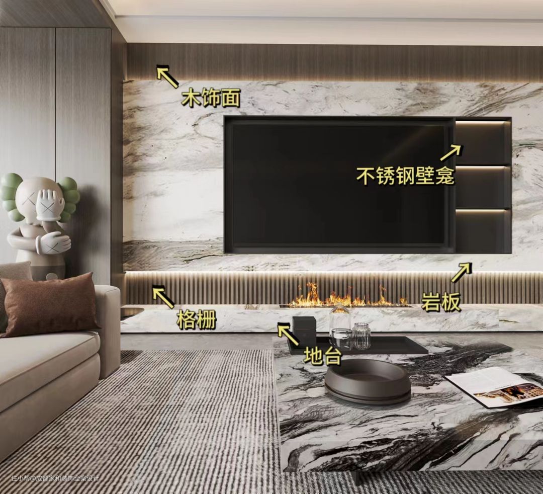 在石膏板造型的基础上,将乳胶漆换成石材或岩板,装饰性又提升一个等级。适合用于现代简约风、轻奢风、极简风等设计中,客厅面积大做这种造型会更有气势。