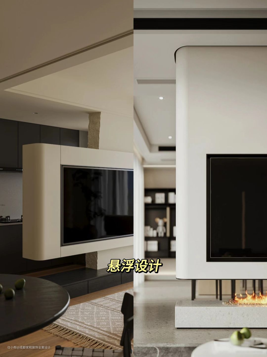 对设计有要求的朋友,可以试试这种悬浮造型的嵌入式电视墙,现代感十足,视觉冲击力非常强,通常结合地台和电子壁炉更为氛围感。这种设计对施工要求较高,但是颜值真的高,预算充足的朋友可以考虑哦。