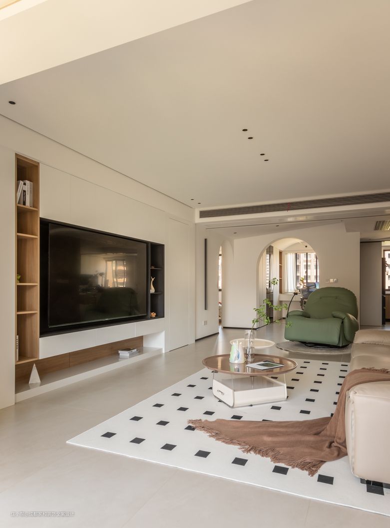 如果想增加客厅的储物能力,可以选择在电视墙定制整墙电视柜,中间做嵌入式电视的设计,这样家里很多东西都可以放在里面,收纳空间直接翻倍。中间放电视的位置可以用与柜门不同色的板材做个撞色,避免单调。如果电视柜门已经做了雕花或弧形之类的造型,嵌入电视的位置就可以简单一些,不然会显得太突兀。