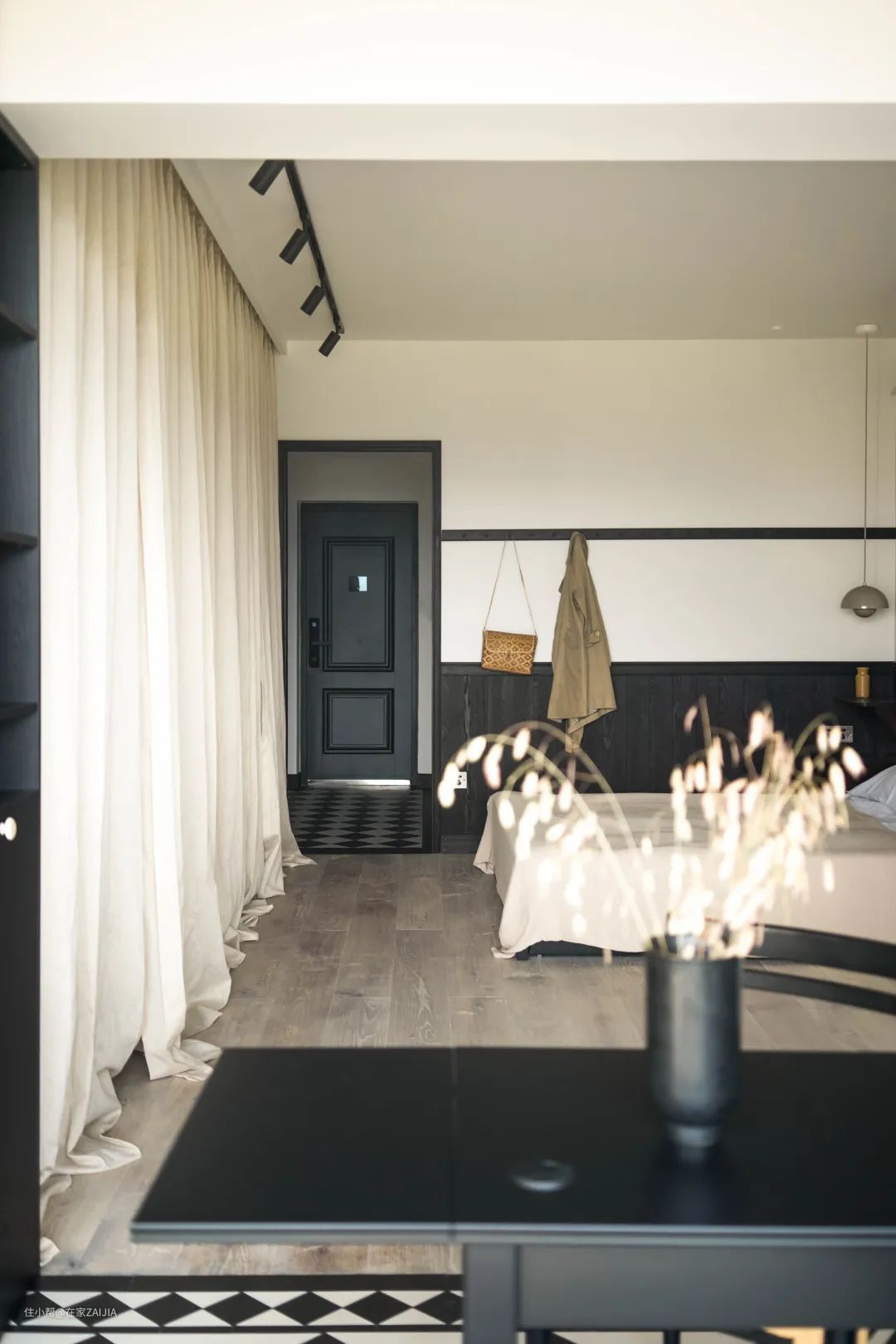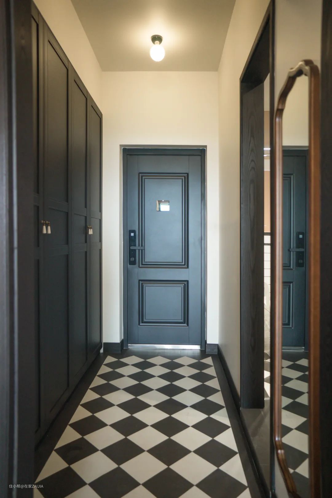 平平无奇又略显局促的走廊式玄关,设计师用黑白斜铺花砖带来满满的入户仪式感,为全屋风格定下了基调。