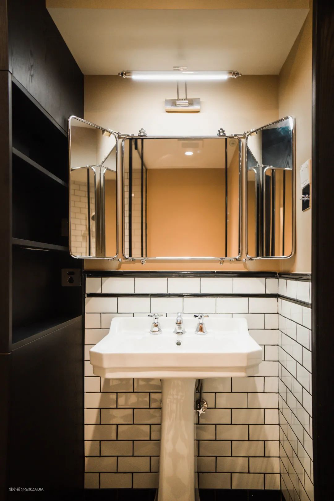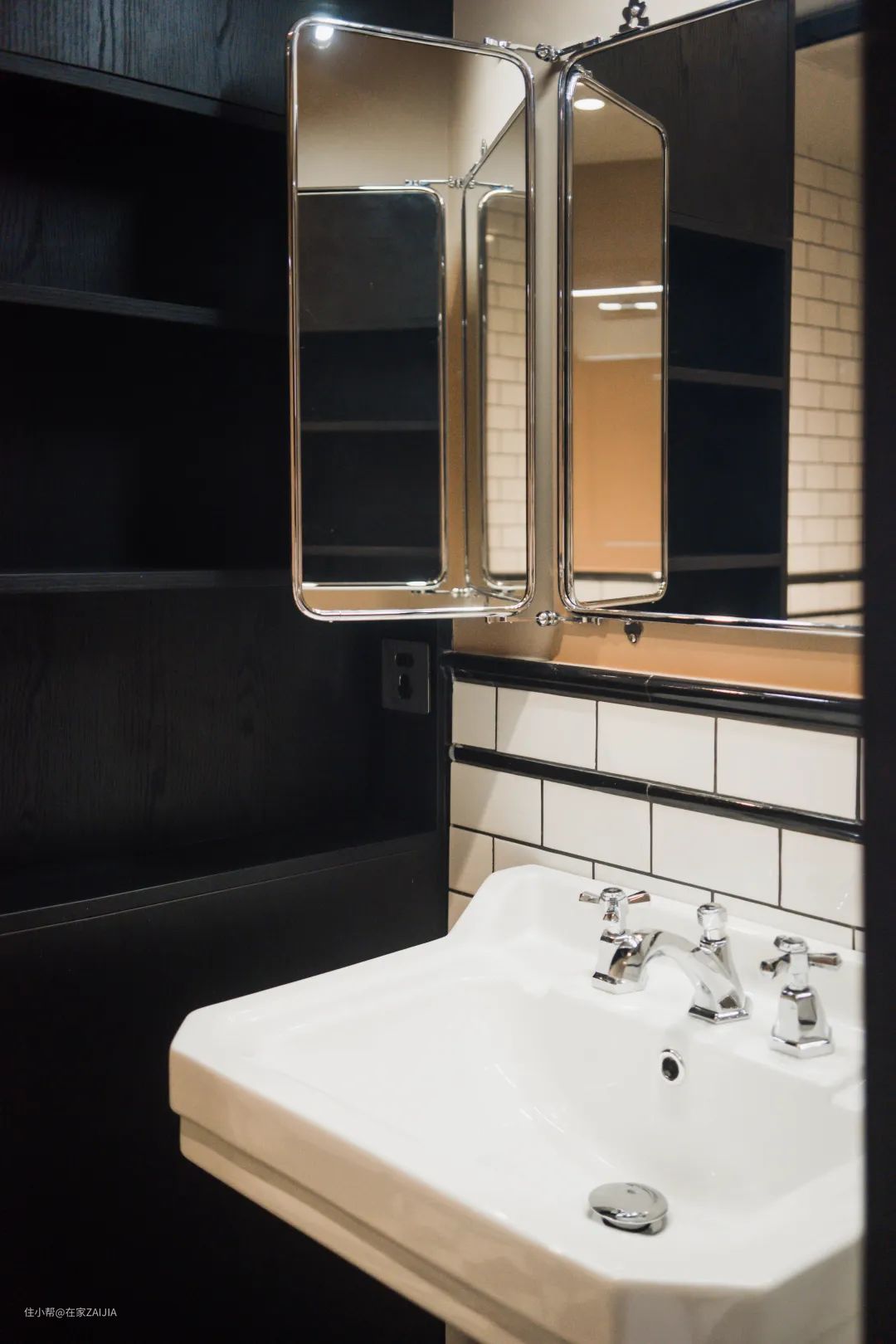 复古的落地式台盆搭配白色小墙砖,把屋主带入曾经再熟悉不过的场景。可以开合的镜子是这里的亮点,方便她每天多个角度整理妆容。