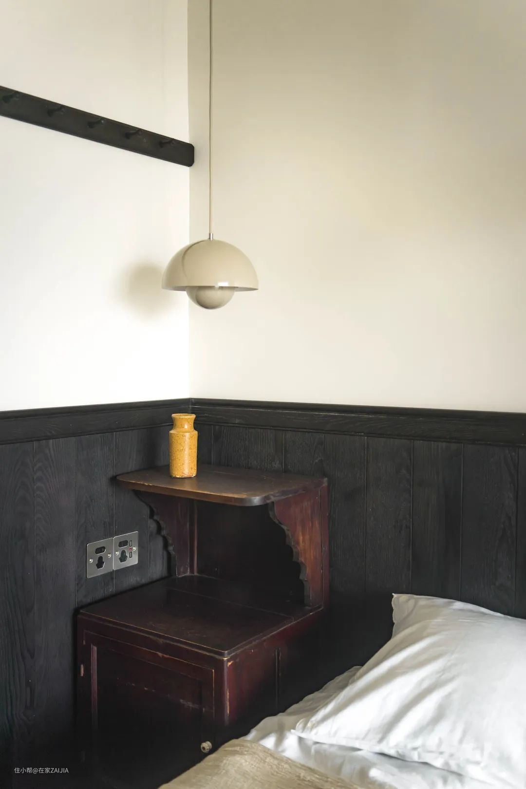 床头柜是从上海淘来的旧家具,和上面的经典花苞灯形成了复古与现代混搭的小气氛。置身其中既赏心悦目,又能让人的情绪快速平静下来。