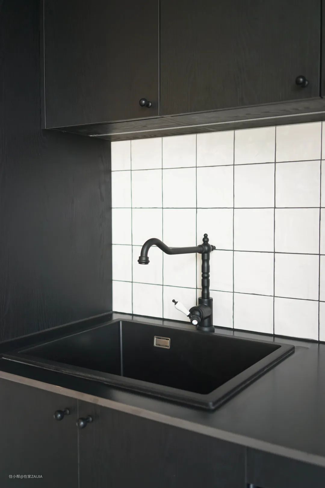 橱柜同样是黑色实木柜门,凹凸有致的墙砖兼具手感和颜值,复古的龙头高级耐看。