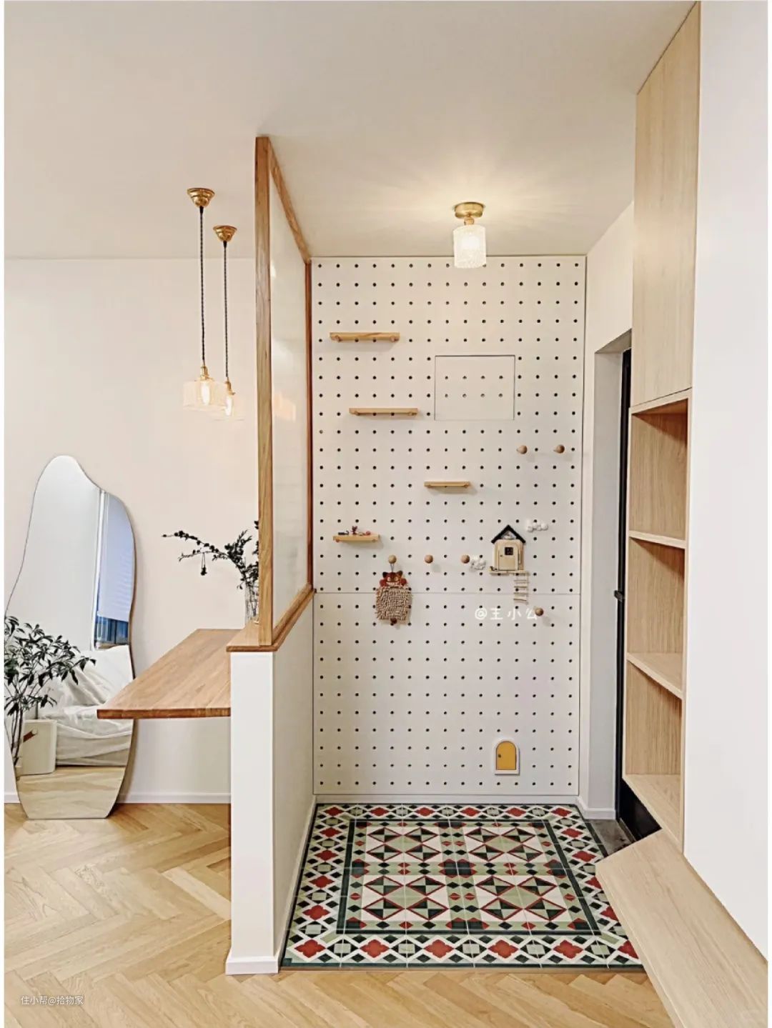这样的设计,因为长虹玻璃的存在,不会影响玄关空间的采光,还增加了玄关处的遮挡。特别是洞洞板的加入,收纳更加随心随意,实用性大大增强。
