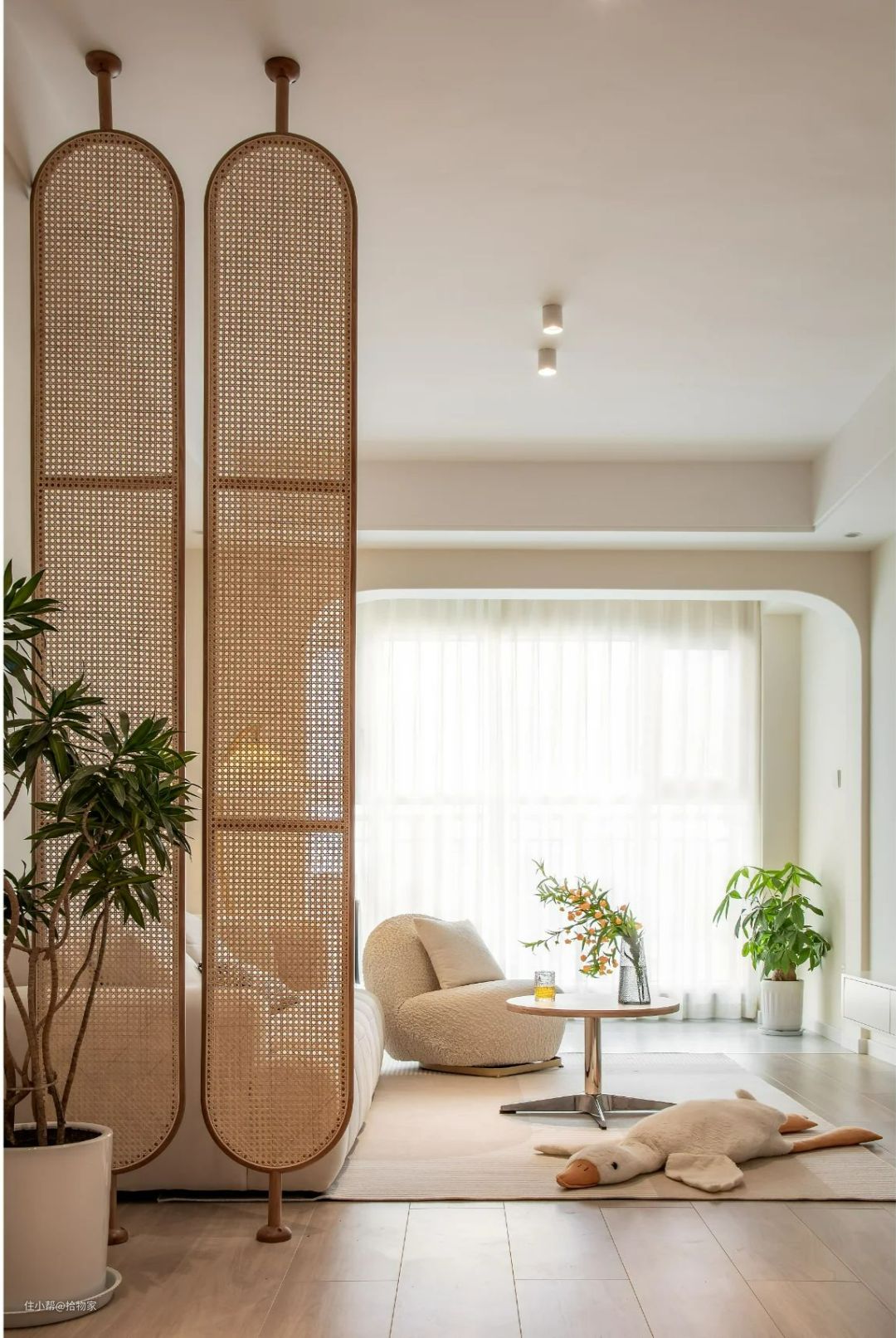 开门见厅的户型,可以利用藤编屏风搞定,透光透影不透人,完美解决开门见厅的弊端。