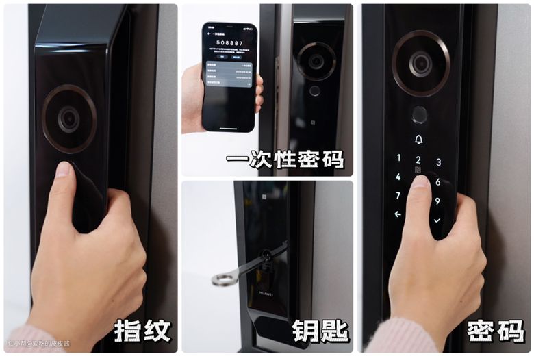 华为对于门外的开锁方式,共有8种,分别是双引擎AI指纹解锁,非常好用,对于老人、小孩都很友好,灵敏识别,支持加密NFC卡片识别,但是需要另外购买,售价49元。