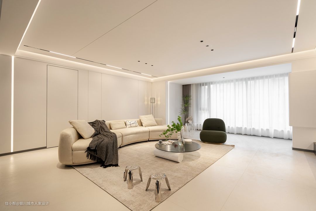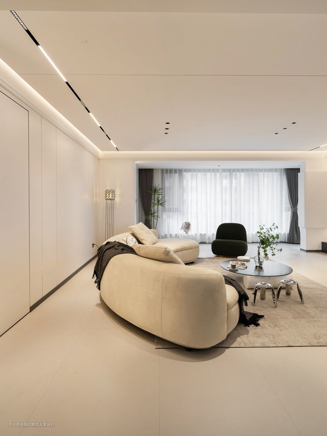 客厅开间6米,足够宽敞,弧形沙发不靠墙,背后的卧室用极窄边框隐形门,与背景墙同色隐与墙面中,一眼看去线条自然衔接整齐干练。