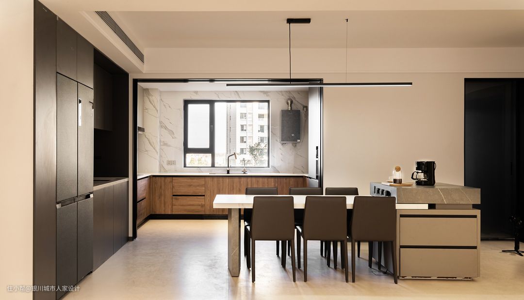 作为家中的核心区域,就餐区告别了传统的封闭格局,成为串联起公共活动区的关键一环。餐桌岛台一体的设计,白色岩板+灰色岩板穿插,颜值高还耐磨防刮。当亲朋好友共聚时,可延长餐桌,供多人同时使用,小酌闲谈,别有一番趣味。