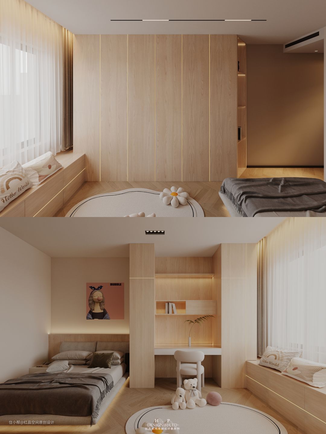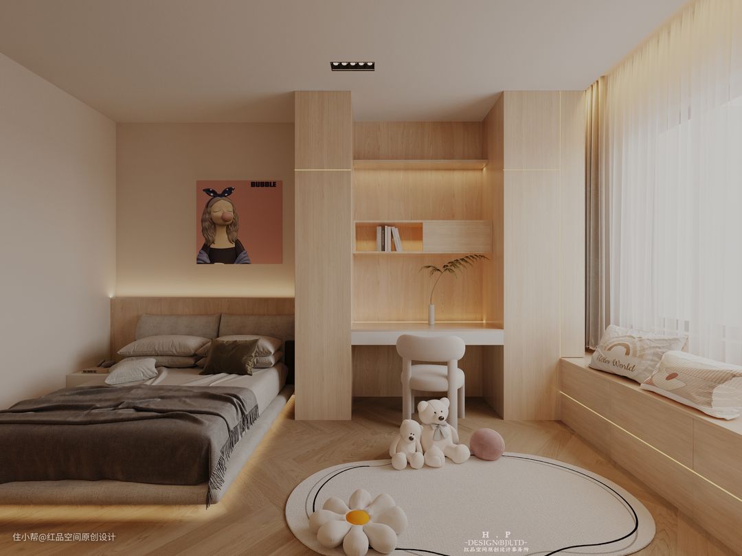 女儿房新增了卫生间,方便又私密。整体采用了暖色调,窗户边用定制收纳柜打造了飘窗,梦幻的纱帘更添温馨。