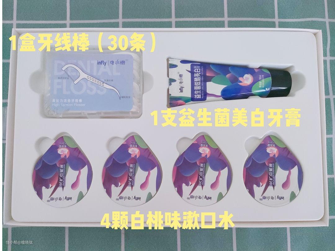 配套口腔护理礼盒中装有4颗元气白桃味的漱口水、1支益生菌炫酷亮白牙膏、1盒牙线棒(30条)。