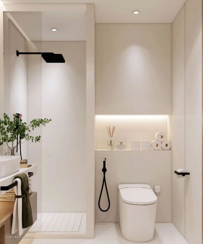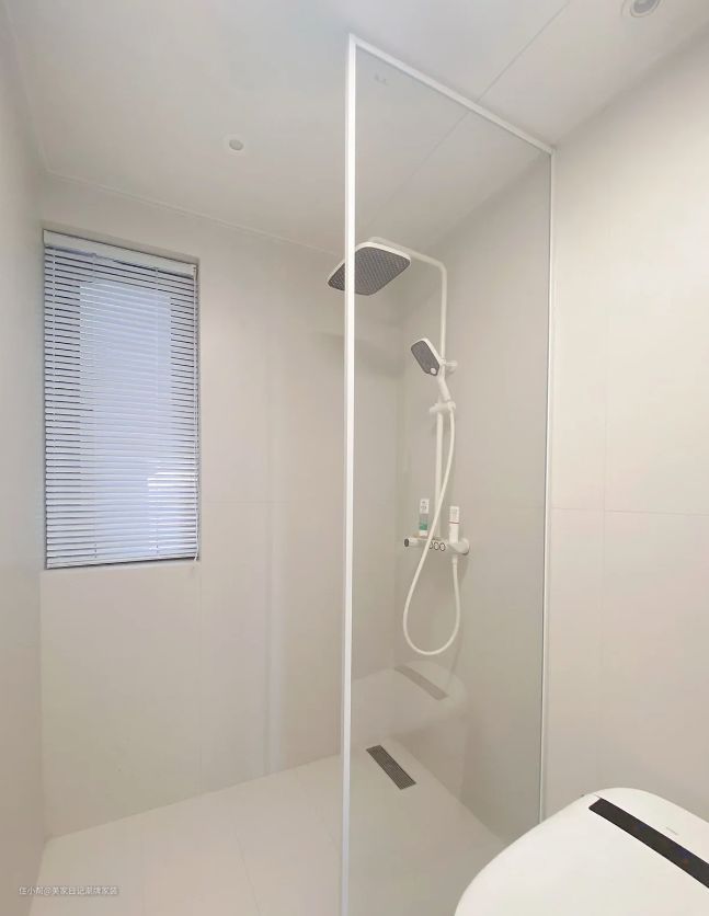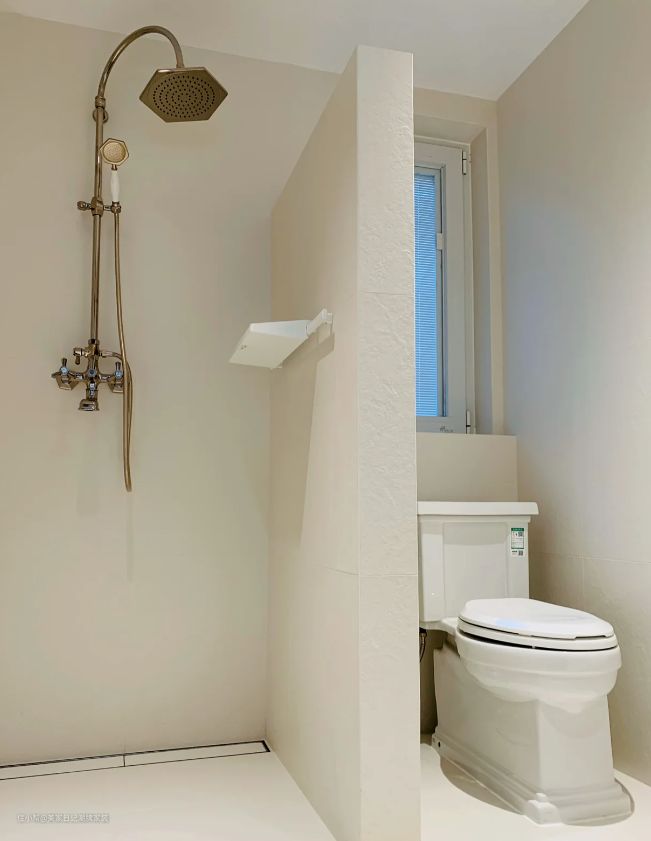如图所示,直接使用墙体代替隔断可解决淋浴水溅的问题。虽然墙体比玻璃厚,占用空间较大,但其安全性远大于玻璃。