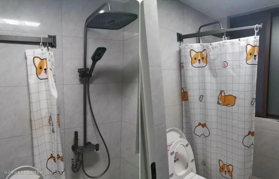 一字浴帘是最常见的伸缩杆+浴帘的做法,成本低廉,防溅水效果良好,不使用时能保证空间最大化。