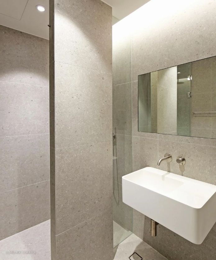 如上图所示,第二种做法是将浴柜的石材下翻,挡住淋浴区的柜体,然后在浴柜石材上方设置玻璃隔断,这才是正确的淋浴遮挡方式,能够有效避免水溅到浴柜。