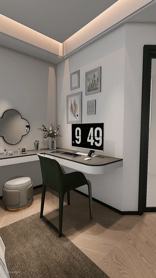 最后,在角落设计一个转角大书桌,左侧作为化妆台,墙面安装化妆镜,桌面上摆放常用的化妆品,方便梳妆打扮;右侧则作为办公桌,放置电脑,方便日常办公学习,休闲追剧也可以,接着搭配插花和装饰画,美观又实用。