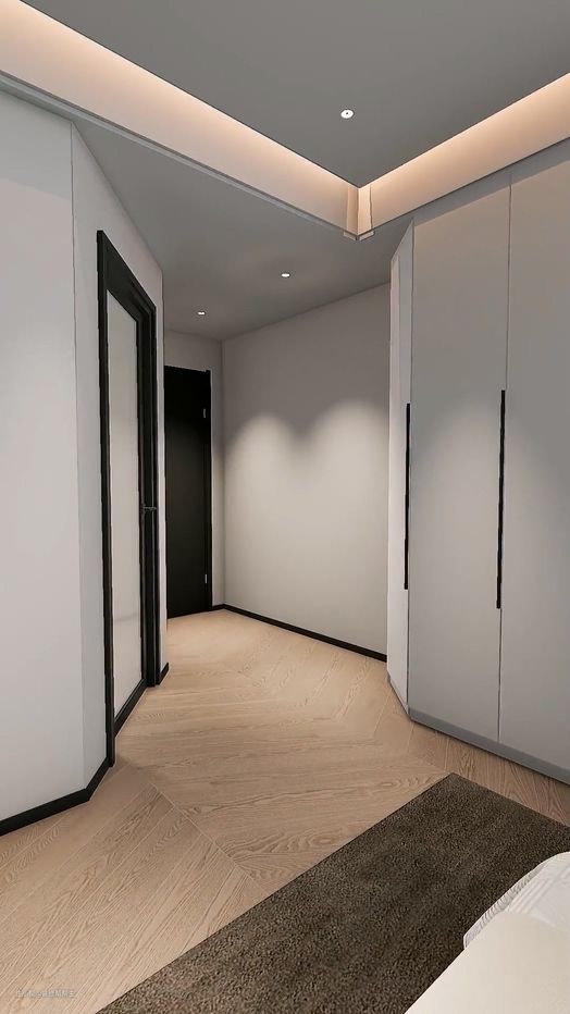 然后,再将衣柜的端头切斜角,把卫浴的墙体也做斜面处理,这样一来,卧室的过道就更宽敞了,完全不会影响到日常生活,和家人一起通过或者搬东西时也不拥挤,卧室看起来也更开阔,采光通风也更佳,这对于卧室的卫浴也更好。
