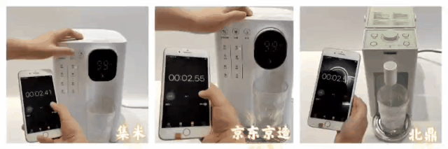 小熊、米家、西屋、京造、集米这5款都能做到1秒内出热水。 小熊真的有点神奇啊,眨眼出热水,真开水,不得不赞叹一声好家伙! 北鼎功率最低,确实出水要慢一些,加热跟不上我可以理解,但是美的用了5秒才出水,这点我不能理解。