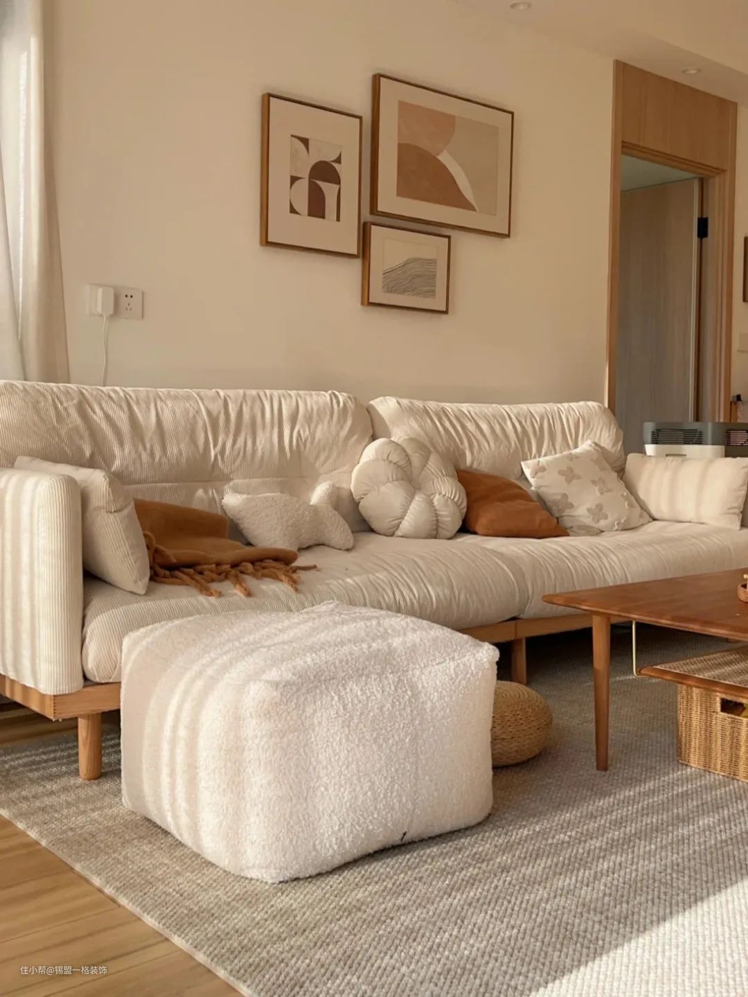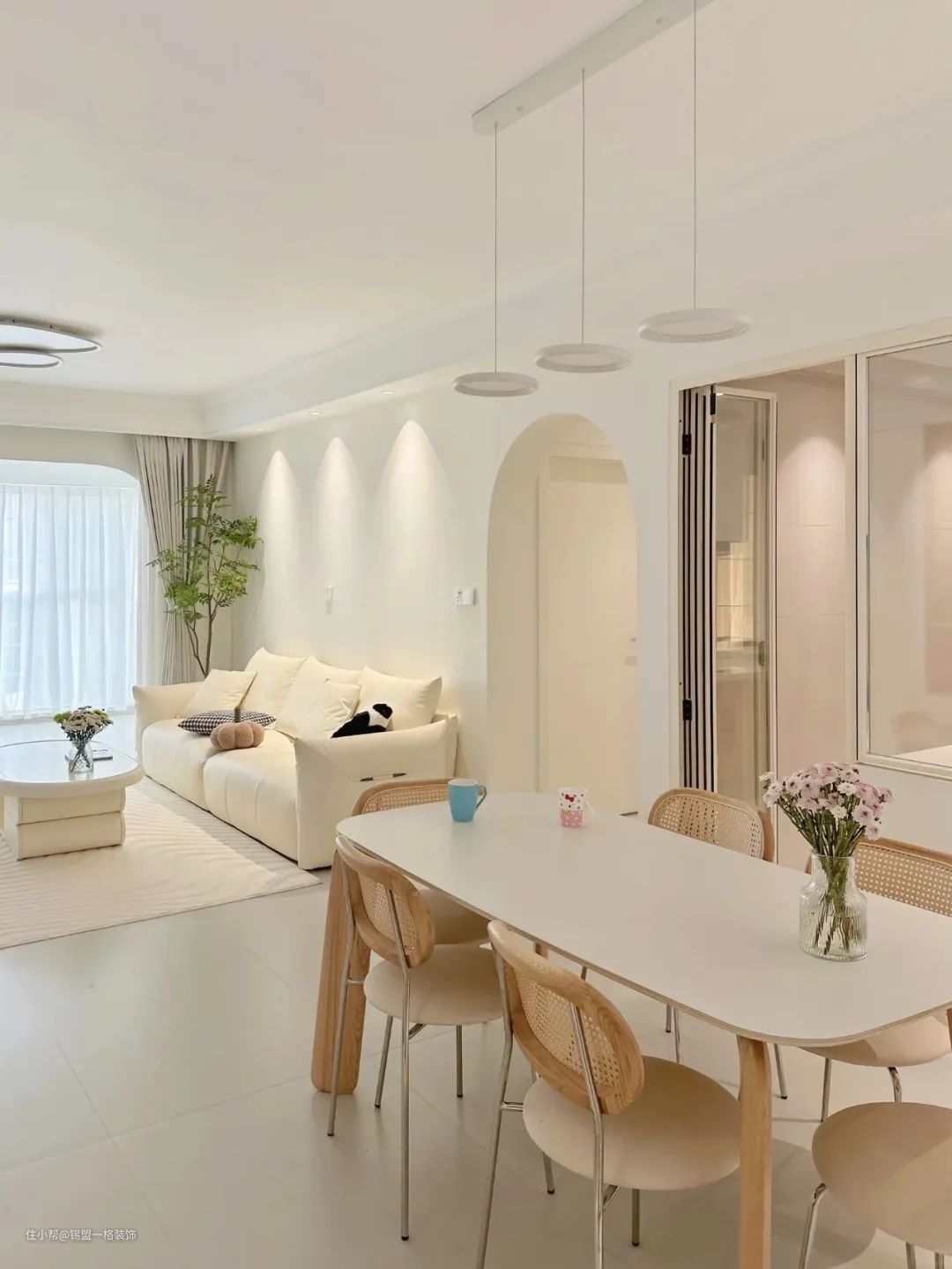 软装元素:浅色墙漆、奶白色地砖、云朵沙发、平顶/弧形吊顶。