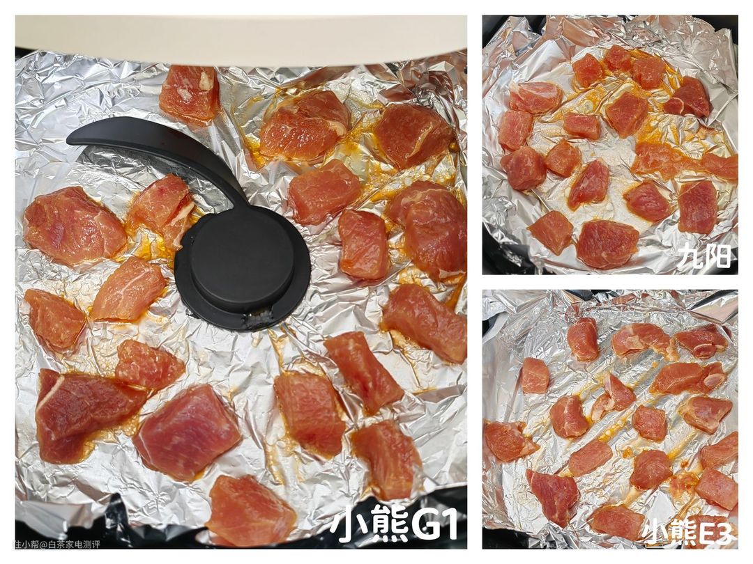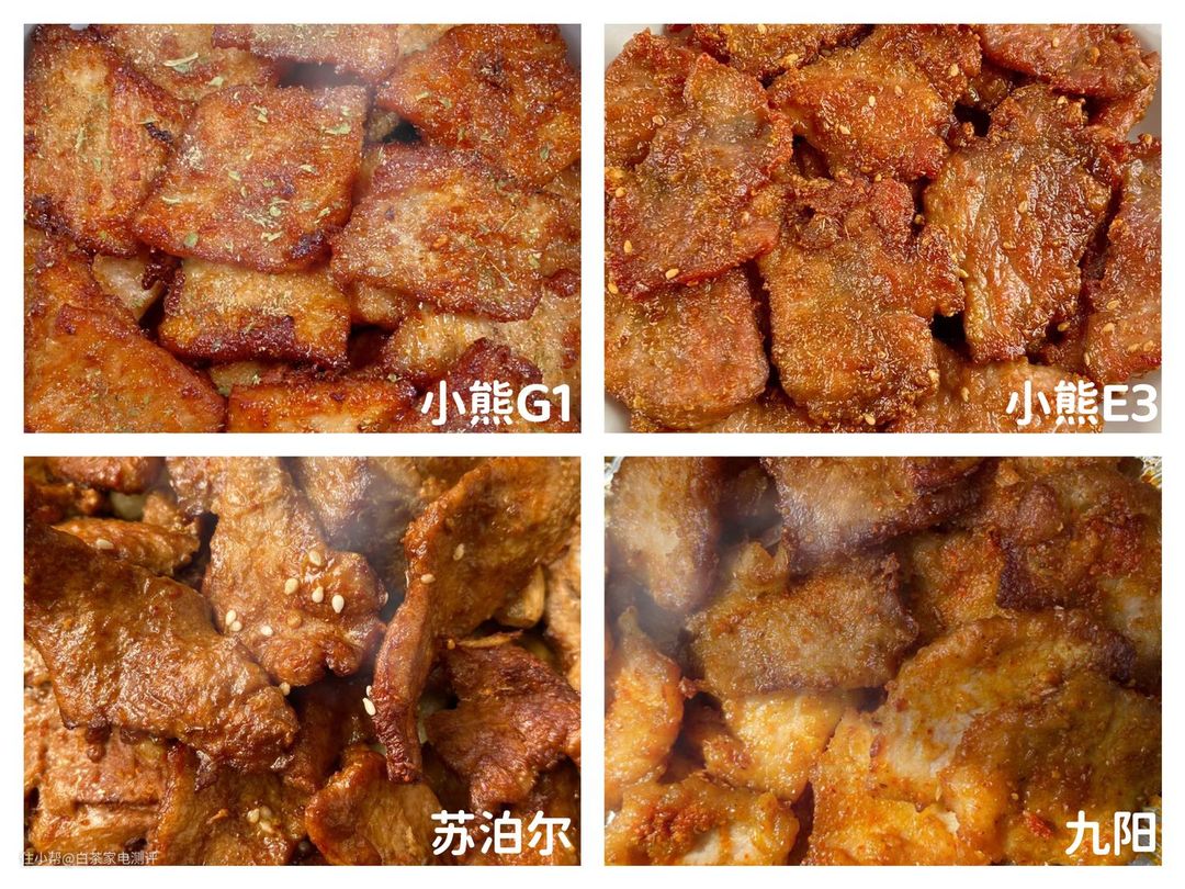 撒上料真的太香了!先来讲讲口感哈,小熊G1的口感最好,外酥里嫩,微蒸汽补水锁住肉汁,每一口都有爆汁的感觉,爱了爱了!小熊E3还可以,咬起来肉也嫩嫩的,脱脂做的没小熊G1优秀,苏泊尔J881、九阳都比较干,特别是苏泊尔,吃起来有点柴柴的。