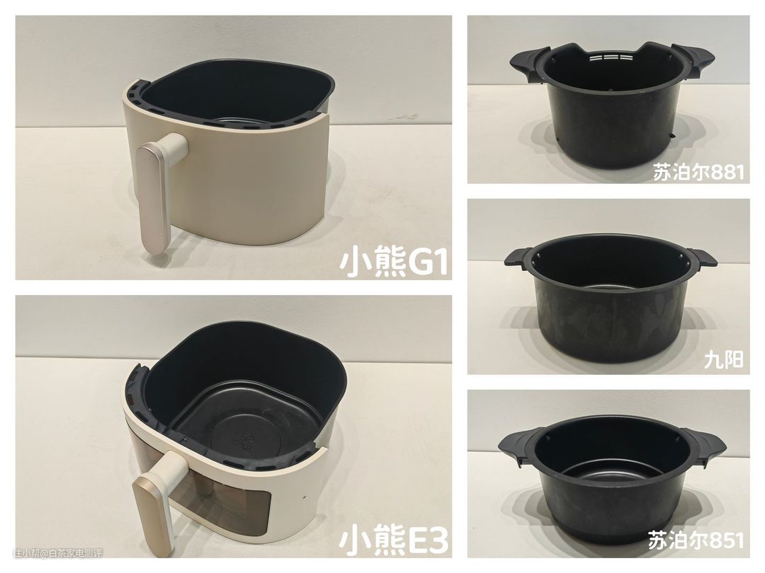 这几款产品的容量都是比较大的,基本是在5-7L之间,能够满足4人及以上的家庭人数的使用需求了!不过值得一提的是,小熊G1的炸锅是比较扁平的设计,不是传统较深的锅,这样的设计能够大大增加食物的受热面积,大大提高受热均匀度