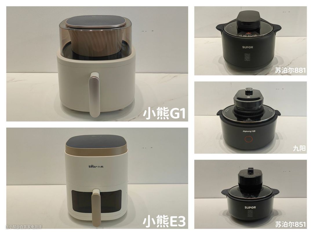 下面我们就来对这五款产品小熊G1、小熊E3、九阳KL55-VF735、苏泊尔KJ50DQ851、苏泊尔KD70DJ881进行一个实测,主要从产品的各个参数进行对比,并且进行炸鸡翅、炸鸡米花、炸薯条、解冻鸡胸肉的测评,废话不多说,先来看这几款产品的参数对比吧!