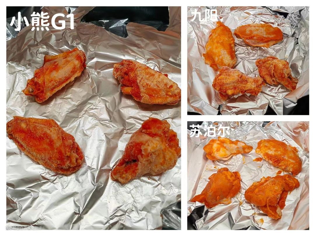 从炸出来的样子看,小熊G1的鸡翅是看起来最好看的,上色均匀,色泽也很不错,苏泊尔KD70DJ881的炸鸡翅也不错,这连个空气炸锅炸出来的鸡翅吃起来口感好,肉质鲜嫩,多汁;苏泊尔KJ50DQ851的鸡翅可能是由于烤制时间比较长,变得有些干,口感也不好。