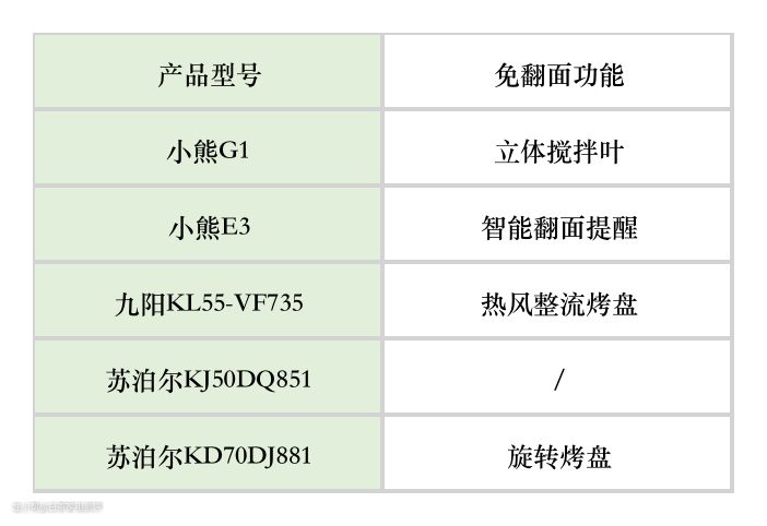 因此这5款的免翻面功能的排序是:小熊G1、苏泊尔KD70DJ881、九阳KL55-VF735、苏泊尔KJ50DQ851、小熊E3。