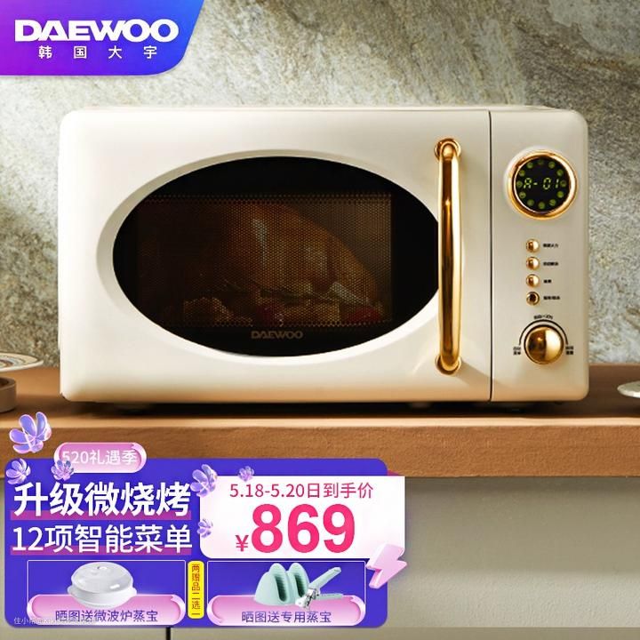 大宇的这款复古微波炉颜值超高,看着小但其实容量很大,20升的空间放一只鸡都够了。微烤一体,即是微波炉,又能当烤箱;有五档火力、3种烧烤模式可选择,非常方便;采用旋转加热,360°旋转加热比平板式微波炉加热更均匀、快速;12种智能菜单可以选择,小白也可以学会精美烹调~各种小细节也很nice~