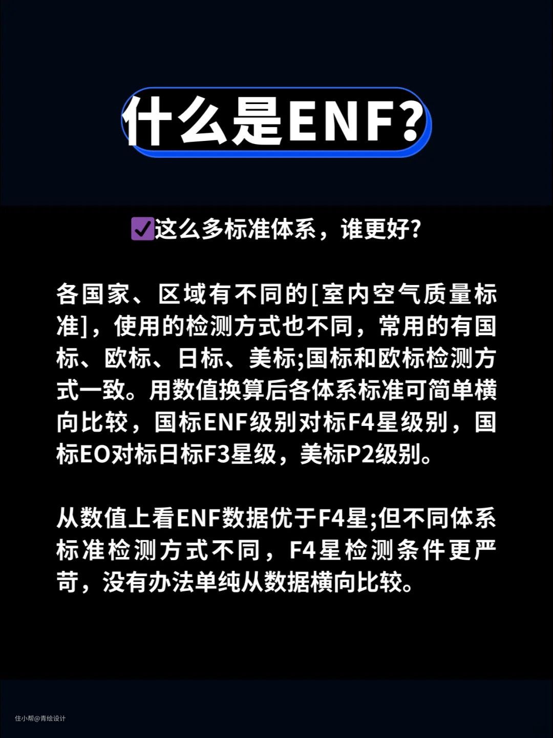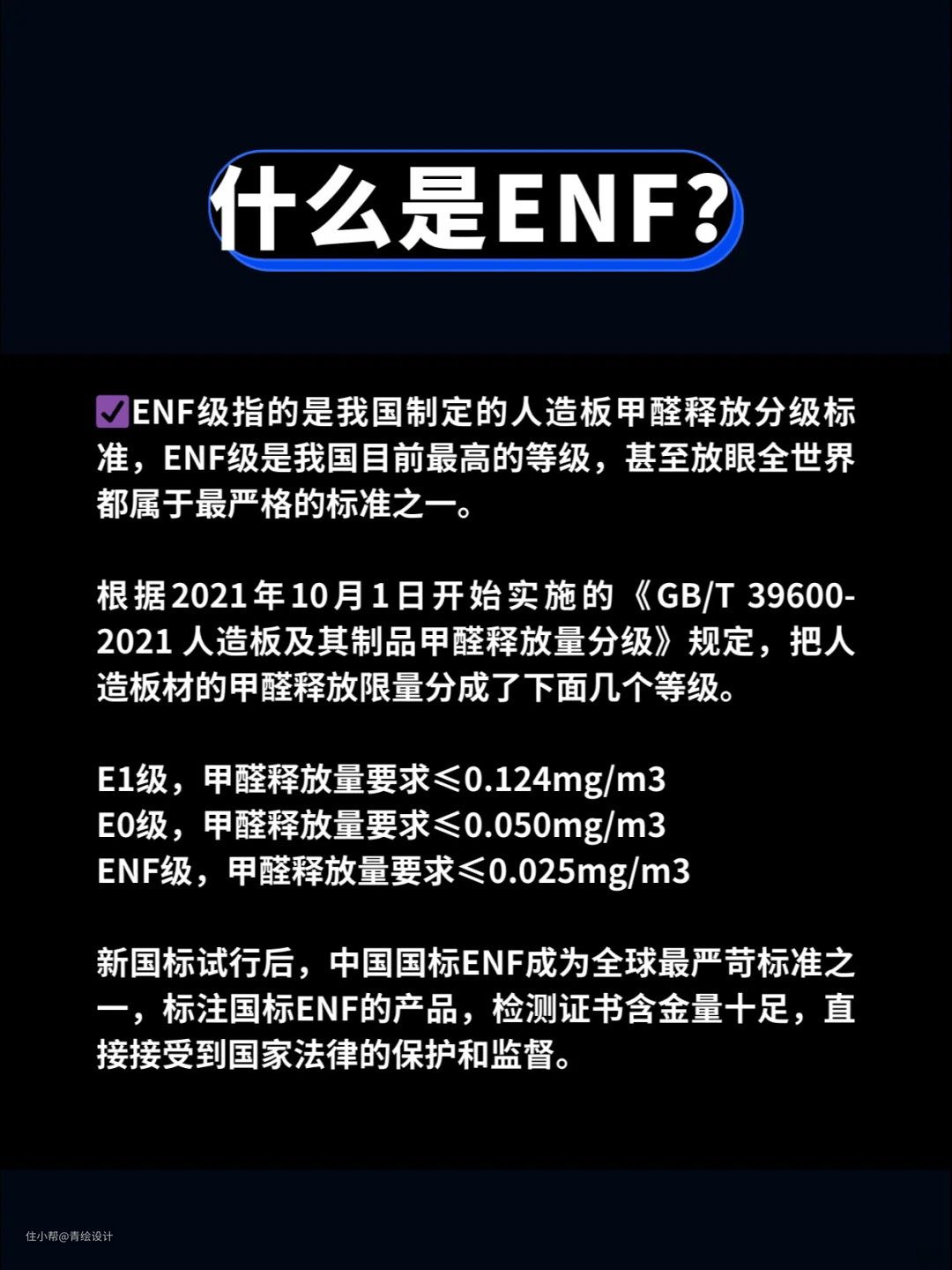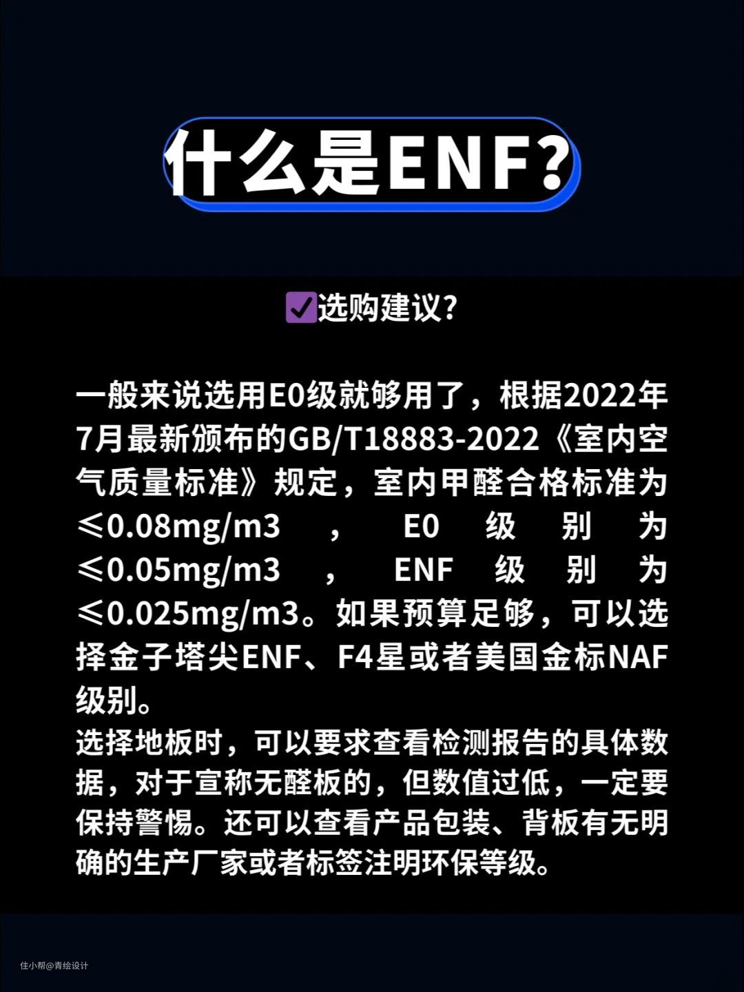 地板ENF环保等级是中国最新实施的关于木地板和其他人造板甲醛释放限量的最高标准。具体来说,ENF级(Emission Not Free)表示甲醛释放量极低,几乎达到“无释放”的状态。按照中国国家标准《室内装饰装修材料人造板及其制品中甲醛释放限量》GB/T 39600-2021的规定,ENF级别的板材要求其甲醛释放量必须小于或等于0.025毫克每立方米。