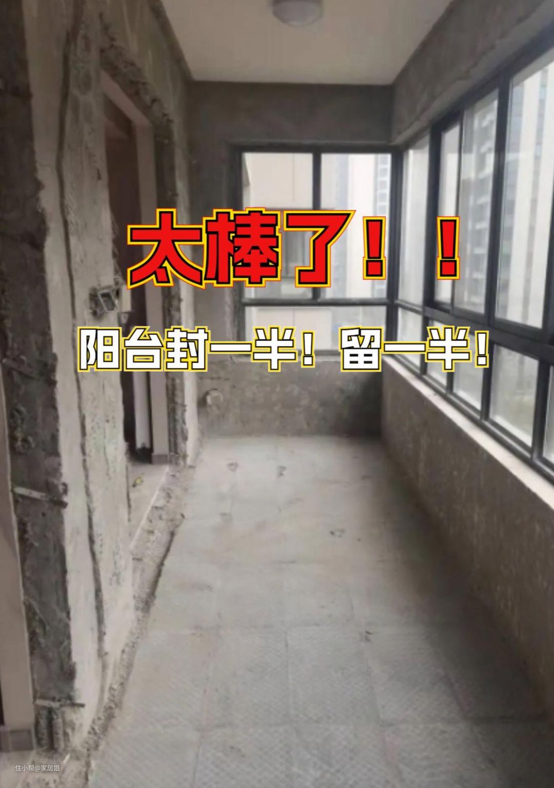 而我发现我家邻居有一种非常聪明的设计方案,就是阳台封一半,留一半。这样可以同时拥有两个功能区,实现两全其美的效果。