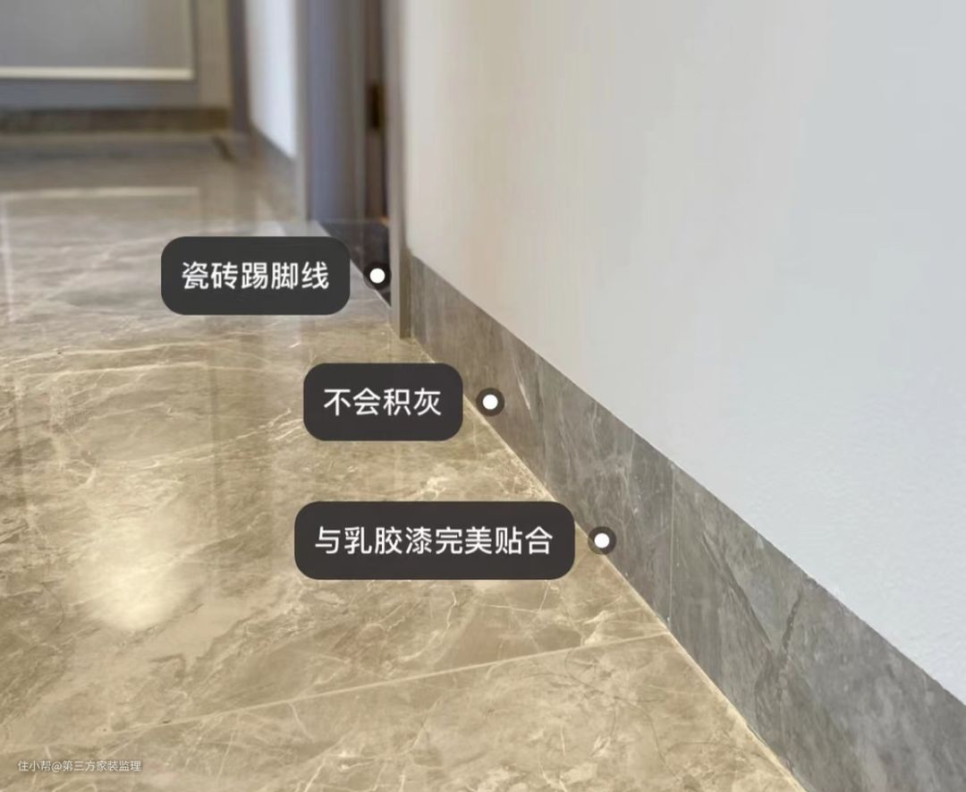 踢脚线的主要作用是保护墙角的作用,如果没有踢脚线,拖地就会碰到墙面,很容易弄脏,就像这样