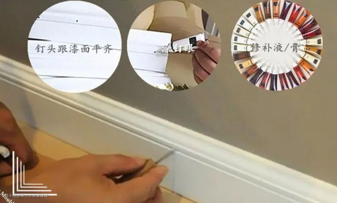 木质踢脚线的施工主要有两种方法,一种是锁扣挂装,一种是无头钉钉装: