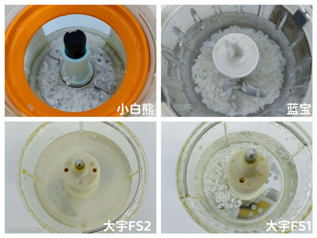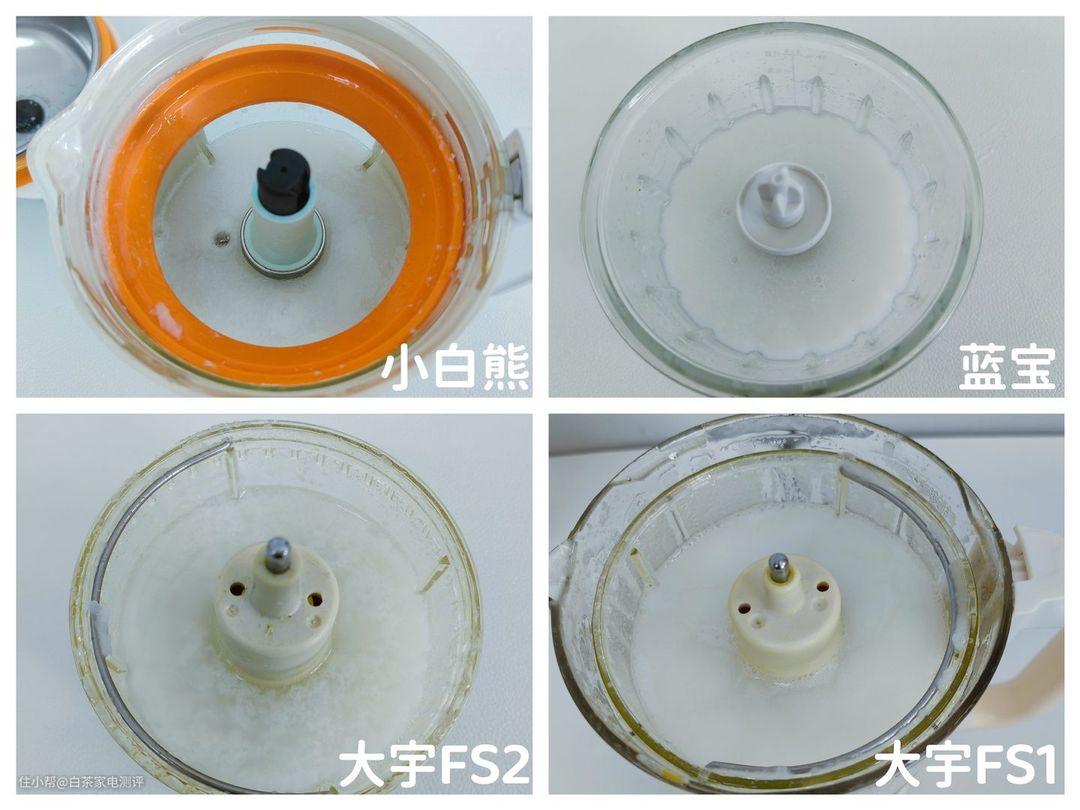 大宇两份是差不多的,但FS2的刀盘是双层,细腻度要好一点,尝起来味道有点水。蓝宝的非常不错,丝滑细腻,尝起来很香甜。得益于蓝宝的搅打时候蒸汽是环绕四周(也就是蒸煮杯支架上的孔)全方位渗入,发热盘区域的水用量很少,口感更浓郁。小白熊打碎的程度其实不错,但不知道是不是刀头的间隔没设计好,刀头里夹住了一些,有食物堆积的现象,本来量就少,这样还浪费了。九阳是手按搅打设计,属于你按得久就打得久,但是他对微量的控制不好,100g太少,有些根本没打到,颗粒感很强。