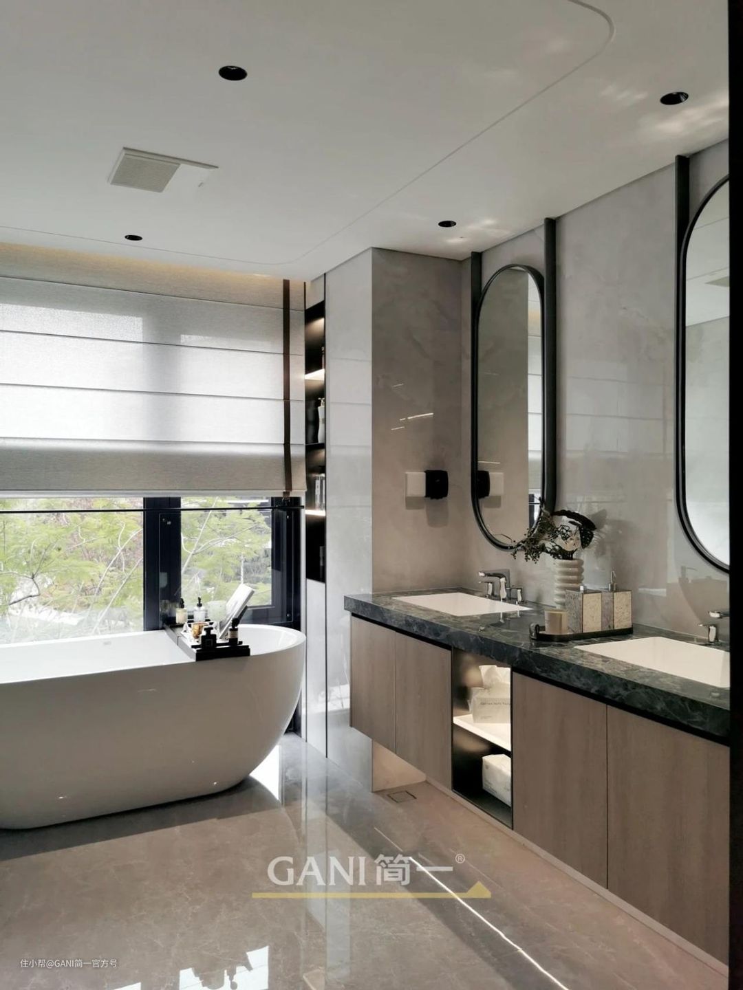 浴室的设计充满了巧思,每一处都细致入微。墙面选用简一浅灰玉大理石瓷砖,与墨绿色洗手台相映生辉,尽显奢华气质。连体式双台盆不分彼此,精心选配的龙头、镜子、灯光与之共同构成一个品质感十足的空间。