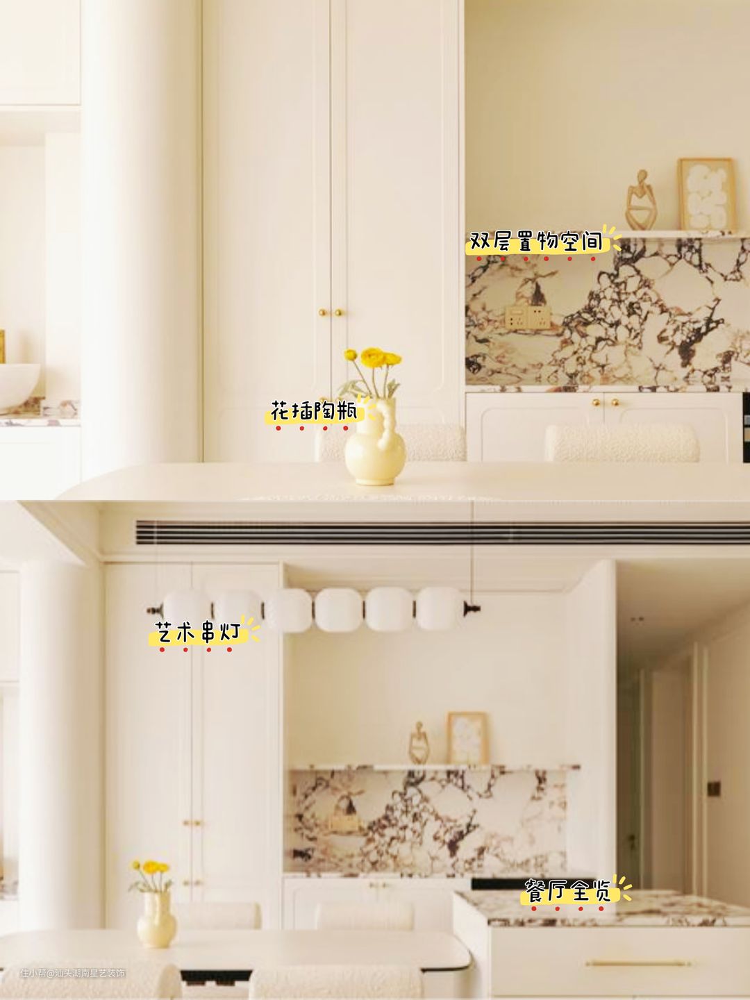 ✅材质上,选择宝格丽石材点缀岛台和餐边柜台面,搭配黄铜金属拉手,给家居轻奢质感。