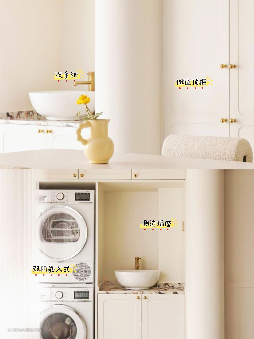 ✅阳台洗衣机+烘干机嵌入柜内,直角墙垛改成弧度,吊顶做弧形设计,弱化直角突兀感。